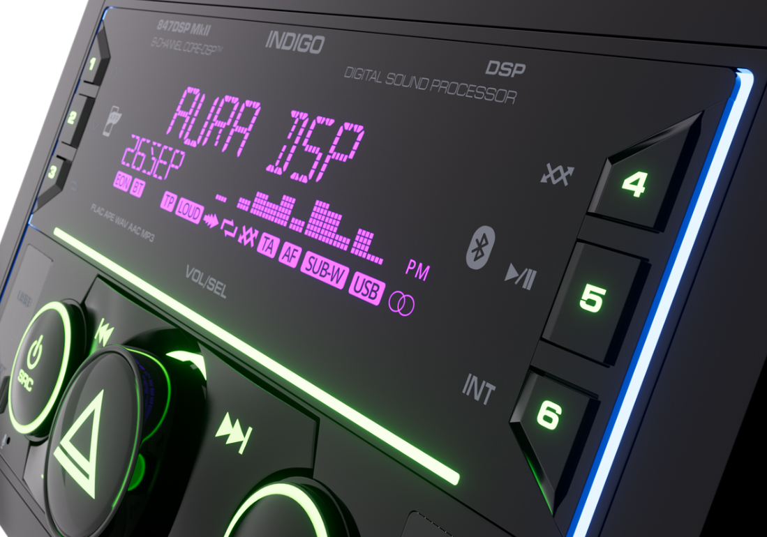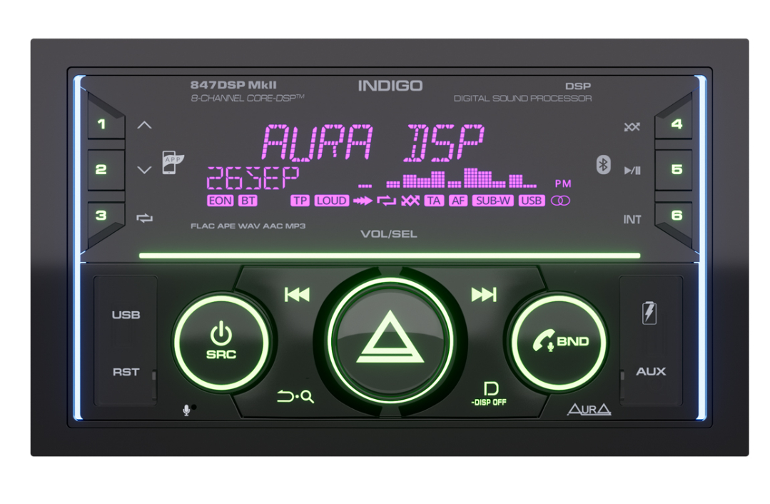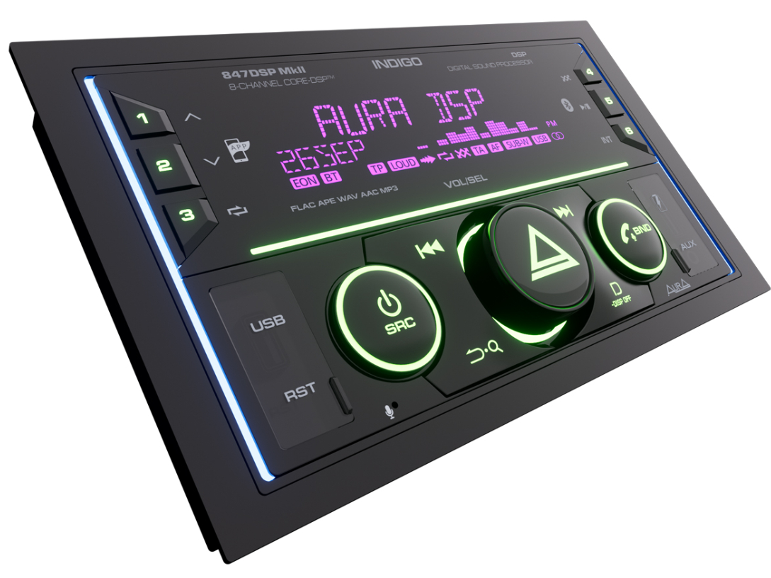 2 DIN автомобильный 8-канальный процессорный BT/USB/FM ресивер Aura INDIGO-847DSP MkII.