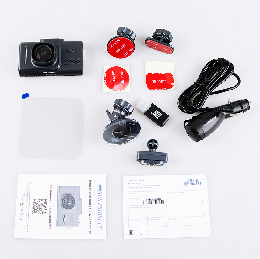 CityScanner 4K комплектуется удобным набором для крепления устройство на лобовое стекло автомобиля. Благодаря магнитному блоку устройство легко снять и установить одним движением. Особенно пригодится водителям, которые убирают ценные вещи, паркуя автомобиль. В комплекте есть насадки на присоске и 3М-скотче, на выбор.