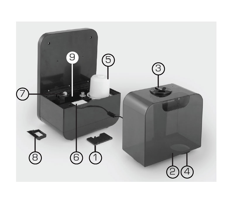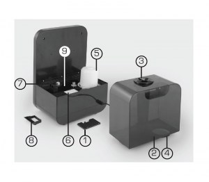 | 1. Решетка воздухозаборника с воздушным фильтром 2. Резервуар для воды с ручкой для переноски 3. Двойное сопло для выхода пара 4. Отверстие для заливания воды 5. Керамический фильтр с крышкой резервуара для воды 6. Защитная крышка испарителя 7. Подсветка резервуара 8. Контейнер для ароматических масел 9. Рабочая камера с распылителем |